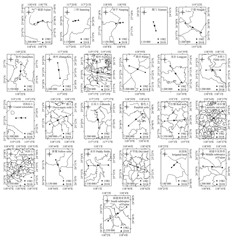 1982—2018年福建省不同区域耕地土壤碳库重心时空变异差异较大,有机碳密度重心迁移方向、角度和距离各不相同(图 4)。碳汇土壤以水稻土、潮土、红壤、水田、水浇地及三明市耕地的有机碳密度重心向东北方向迁移,说明近40年这些土壤以东北区域的有机碳密度上升较多,碳汇效果更显著;对比垂直(南北)与水平(东西)方向变异强度发现,区域耕地有机碳密度重心分别向东(高经度)迁移了0.0217°、0.0382°、0.0546°、0.0233°、0.0033°和0.0062°,均强于向北(高纬度)迁移,即向东变异程度大于向北,表明该区域东部耕地的单位面积土壤固碳增汇量大于北部耕地;南平、泉州等市域碳汇土壤和福建南亚热带碳汇土壤均以西南部耕地土壤有机碳密度上升较多,厦门、宁德、漳州、龙岩等市域碳汇土壤和石灰土碳汇以东南部耕地土壤有机碳密度上升较多,福州市碳汇土壤以西北部耕地土壤有机碳密度上升较多。从碳源土壤来看,滨海盐土、赤红壤、风砂土、紫色土有机碳密度重心向西南方向迁移,且向西变异强于向南,即这些土壤均以西南区域耕地有机碳密度下降较少,且西部区域有机碳密度下降幅度低于南部区域;而莆田市、旱地、黄壤等区域耕地分别以西北、东南、西北部土壤有机碳密度下降较少。