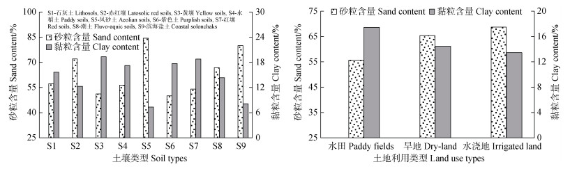 质地特征可表征土壤的通气性和保肥性,对土壤碳组分的稳定性及分解速度具有重大影响[19,43]。如图 6所示,福建省滨海盐土、潮土、赤红壤和风砂土的砂粒含量介于66%~85%之间,明显高于其他土壤类型(50%~58%),砂粒含量丰富的土壤具有孔隙度大、通气性好、好氧微生物活性强等特点,土壤有机质矿化作用强烈而难以稳定积累,它们是福建省耕地有机碳密度最低的4类土壤[44]。Konen等[45]也发现,耕地土壤有机碳与砂粒含量呈显著负相关(r=0.87*)。黄壤、水稻土、石灰土、红壤和紫色土的黏粒含量较高,且分布区域普遍高于滨海盐土、潮土、赤红壤和风砂土,特别是黄壤平均海拔高度达979.27 m,高海拔低温多雨环境下土壤有机质分解缓慢;水稻土外源有机物质输入较多,长期淹水导致通气性较差,微生物活动弱而有机质容易积累,所以这些土壤的有机碳密度也较高[6,23]。不同土地利用类型以水田土壤黏粒含量最高、砂粒含量最低,一方面土壤湿度较高而通气不畅,好氧微生物活动常受抑制,且黏粒的巨大比表面积具有更强的土壤有机质吸附能力,可与腐殖质等大分子有机物质形成稳固的有机无机团聚体而不易被矿化分解,所以水田是福建省耕地土壤有机碳密度最高、固碳增汇效应最明显的土地利用方式[46-47]。旱地土壤通气状况良好,有机质矿化速率较快,有机碳密度显著低于水田,是福建省唯一的碳源土地利用类型,这与很多学者的研究结果一致[48-49]。第三次全国国土调查显示,福建省水田和旱地面积占比分别为84.82%和11.76%,在粮食安全和“双碳”战略背景下,未来福建省要进一步巩固增强水田土壤碳汇功能,还需针对性防止旱地土壤碳损失,特别是莆田市旱地面积比例高达33.19%,这也是该区域耕地总体表现为碳源的原因之一。