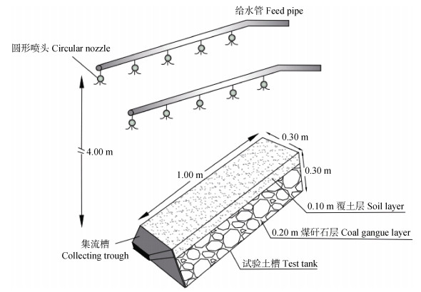 供试土样为排土场内土壤和下层煤矸石。现场取土采取“S”型取样法选取5个样点(0~50 cm),将其混合装袋,将试验土样带回实验室后分别进行风干和过筛,去掉土壤的根系和石块等杂质,煤矸石过20 mm和10 mm孔径的筛子,取10~20 mm孔径碎石和小于10 mm孔径的土壤样品。首先将煤矸石填入土槽底部,合计20 cm,按照每10 cm一个土层分两层填入土槽,每层进行打毛处理;其次填入土壤,土壤厚度为10 cm,模拟排土场覆土状态,控制容重接近设计容重(相对误差不超过5%)。