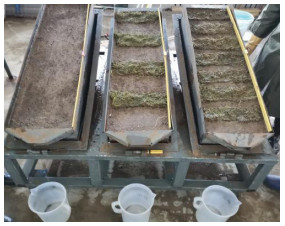 本试验根据野外排土场实际坡度,设计为35°。根据当地多年降雨资料及短时间暴雨的计算方法,试验设计3个降雨强度(50 mm·h –1、75 mm·h –1、100 mm·h –1),降雨历时为45 min。已有研究表明40%~50%的植被覆盖度减流减沙效益显著,达50%时,植被格局的减流减沙效益分别为49.62%及80.54%,而70%~80%的植被覆盖度为临界覆盖度,植被可发挥最大的蓄水保土作用[16-17],同时,结合现场踏查结果,设计3个植被覆盖度(0%、40%、70%)开展试验。植被采用横坡带状种植方式[5,21](图 3),使草带与土槽等高线平行,垂直于径流方向,不断拦截、分割坡面水流,起到阶梯式分级阻控作用,能有效消减径流的冲刷动能。通过控制带宽10 cm来控制植被覆盖度,在土层上铺设厚度为1~2 cm草皮的方式进行种草,对草皮进行定期浇水,保持草被高度在10~15 cm。1个月后,待草根完全扎入土壤且植被实际覆盖度满足试验要求后再开展降雨试验,每场试验设计3个重复。