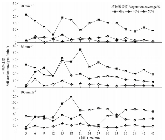 2 结果 2.1 土壤剥蚀率随降雨历时的变化规律降雨历时45 min(图 4),40%和70%植被覆盖度土壤剥蚀率均表现为先增大后减小,持续波动后趋于稳定变化。0%植被覆盖度下土壤剥蚀率波动幅度较为显著,表现为降雨初期前3 min的土壤剥蚀率较大,而后迅速下降,6 min后递减速度放缓,15 min后出现峰值,随时间的延长最终趋于稳定。对比整个降雨历时,植被覆盖度40%和70%的平均土壤剥蚀率,于降雨强度为50 mm·h –1时,分别为0%植被覆盖度的19.86%和13.33%;降雨强度为75 mm·h –1时,分别为0%植被覆盖度的57.59%和15.83%;降雨强度为100 mm·h –1时,分别为0%植被覆盖度的59.01%和24.35%。相同降雨强度,平均土壤剥蚀率整体随植被覆盖度的增大而显著减小(P < 0.05)。0%、40%及70%植被覆盖度下,随降雨强度的增加总土壤剥蚀率呈极显著增加(P < 0.01)。当植被覆盖度为0%时,降雨强度为50 mm·h –1、75 mm·h –1、100 mm·h –1时的总土壤剥蚀率最大值可分别达203 g·m−2·min−1、435 g·m−2·min−1及1044 g·m−2·min−1。在相同植被覆盖度下,总土壤剥蚀率随降雨强度的增加而增大,与张乐涛等[14]研究工程堆积体陡坡坡面土壤侵蚀水动力学过程结果类似。