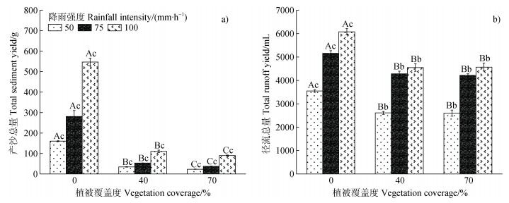 注:不同小写字母表示同一植被覆盖度下不同降雨强度间的差异显著(P < 0.05),不同大写字母表示同一降雨强度下不同植被覆盖度间的差异显著(P < 0.05)。 Note: Different lowercase letters indicated significant differences among different rainfall intensities under the same vegetation coverage(P < 0.05), and different capital letters indicated significant differences in different vegetation cover under the same rainfall intensity(P < 0.05). 图 5 不同植被覆盖度和降雨强度影响下产沙总量(a)和径流总量(b) Fig. 5 Sediment yield and runoff under the influence of different vegetation coverage(a) and rainfall intensity(b) |