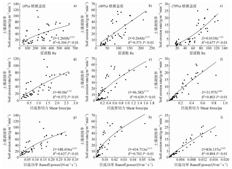 对不同植被覆盖度的土壤剥蚀率与雷诺数、剪切力、径流功率进行回归分析。植被覆盖度对雷诺数、径流剪切力、径流功率的贡献率大于降雨强度、降雨强度和植被覆盖度的交互作用,贡献率分别为58%、46%和48%(表 1)。植被覆盖度为0%、40%、70%时,平均土壤剥蚀率与平均雷诺数、平均径流剪切力和平均径流功率均呈极显著的幂函数关系(P < 0.01)(图 6),其中,植被覆盖度为70%的拟合度最好,且植被覆盖度为70%时土壤剥蚀率与径流功率回归效果最显著,决定系数R2为0.894,径流剪切力次之。表明植被覆盖度增加,径流流速减慢,功率减小,且植被为横坡带状种植,可起阶梯式分级阻控作用,能有效消减径流的冲刷动能。因此,土壤剥蚀率直接受径流功率和径流剪切力的影响,这两个指标直接反映径流携沙能力的大小。不同植被覆盖度下,土壤剥蚀率与雷诺数的拟合度均小于剪切力和径流功率。雷诺数的数值大多反映的是坡面水流流态,间接反映径流的侵蚀能力,所以拟合效果相对较差,与戴佳栋等[11]的研究结果有所不同,可能源于后者的研究对象为耕地,随耕作侵蚀强度的增加,上坡部位土层在耕作侵蚀作用下变浅变薄后会对坡面水流流态产生影响。