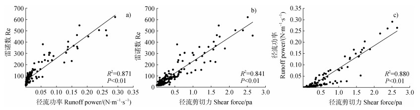 由于水动力学参数与土壤剥蚀率之间均具有较好的相关性,多以水流功率、径流剪切力、单位水流功率等为衡量水动力学的临界动力条件[30-31]。研究选取了雷诺数、剪切力和径流功率三个水动力学参数进行分析,结果显示,三者存在极显著的线性正相关关系(P < 0.01)(图 7),在三者的共同作用下,坡面径流量及产沙量随着降雨强度的增大而增加,土壤侵蚀程度加剧。各水动力学参数与土壤剥蚀率进行拟合,均呈极显著的幂函数关系(P < 0.01),其中,植被覆盖度为70%的相关系数最高(图 6)。相比裸地而言,增加植被覆盖度更能体现土壤剥蚀率与其他水动力学参数之间的相关关系。拟合结果显示径流功率优于径流剪切力对土壤剥蚀率的描述,这与康宏亮等[13]在降雨条件下风沙区砾石对堆积体坡面径流及侵蚀特征研究结果一致,而土壤剥蚀率与径流功率回归效果最显著,与白玉洁等[10]、张乐涛等[14]、张祎帆等[20]研究结果一致。