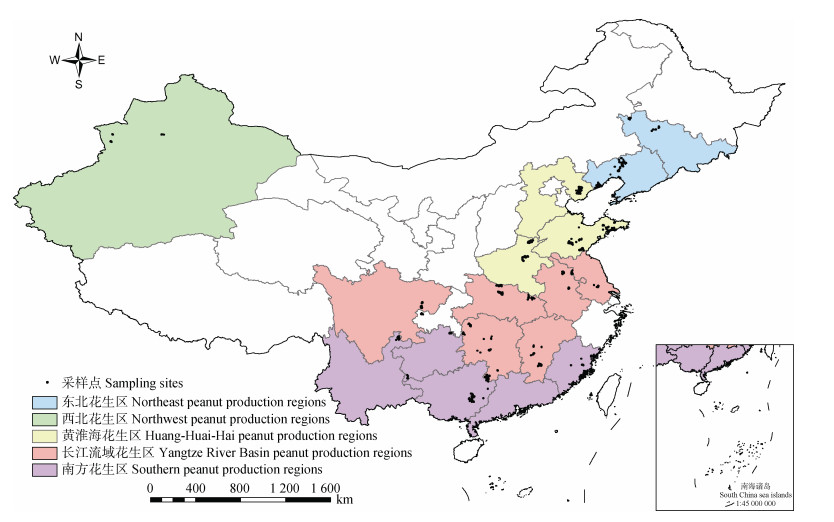 1 材料与方法 1.1 研究区概况中国花生种植区分布广泛,本研究依托国家花生产业技术体系25个综合试验站,在各综合试验站重点联系的主产县(市、区),选择代表性花生种植户的田块进行采样,共采集土壤样品1 020个,涵盖了我国17个花生种植省(市),包括东北区(吉林50个、辽宁101个)151个;黄淮海区(河北47个、河南96个、山东125个)268个;长江流域区(安徽50个、湖北92个、湖南42个、江苏50个、江西48个、四川50个)332个;南方区(福建53、广东50、广西50个、贵州50个、云南25个)228个;西北区(新疆维吾尔自治区41个)41个(图 1)。同时记录取样田块的经纬度,调查取样田块的花生产量、种植模式、起垄方式和覆膜方式等信息。