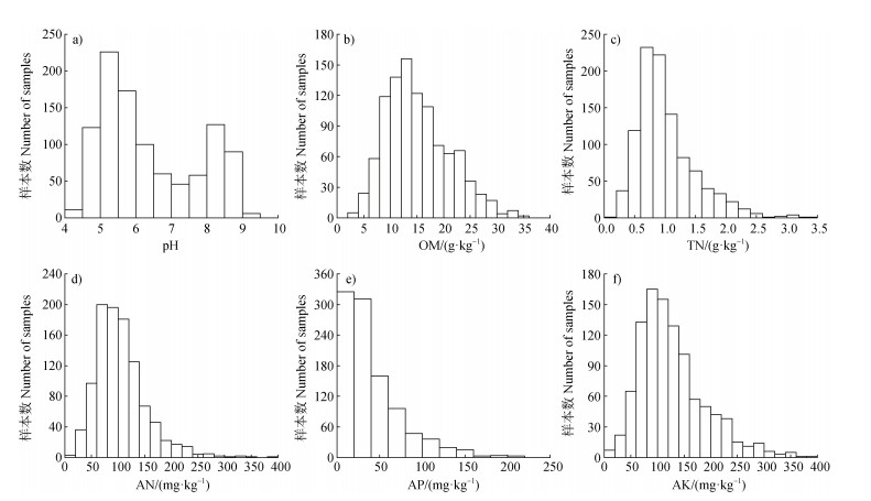 图 2 土壤pH(a)及养分(b. 有机质,c. 全氮,d. 碱解氮,e. 有效磷,f. 速效钾)含量的直方图 Fig. 2 Histogram of soil pH(a)and nutrient content(b. organic matter, c. total nitrogen, d. alkaline nitrogen, e. available phosphorus, f. available potassium) |