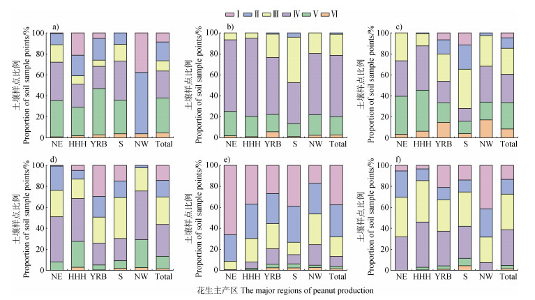 注:Ⅰ~Ⅵ代表土壤pH、OM、TN、AN、AP、AK的分级级别(见表 1)。 Note:The grades Ⅰ to Ⅵ represent the classification levels of soil pH,OM,TN,AN,AP,and AK(Table 1). 图 3 我国花生典型种植区土壤pH(a)及养分(b. 有机质,c. 全氮,d. 碱解氮,e. 有效磷,f. 速效钾)丰缺状况 Fig. 3 Soil pH(a)and nutrients(b. organic matter, c. total nitrogen, d. alkaline nitrogen, e. available phosphorus, f. available potassium)deficiency status in typical peanut production regions in China |