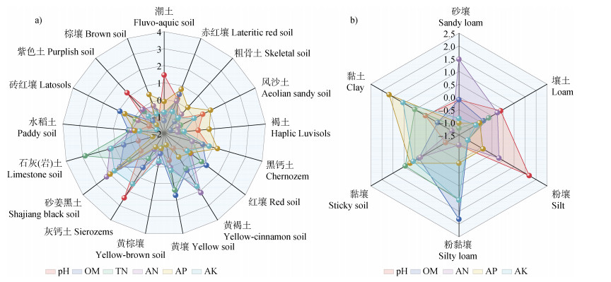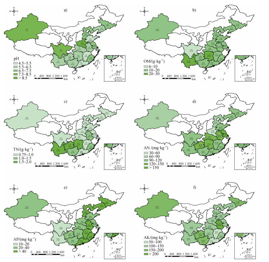 土壤样品测定了能够较好反映土壤肥力水平的6大指标,包括pH、有机质(OM)、全氮(TN)、碱解氮(AN)、有效磷(AP)和速效钾(AK)含量。采用鲍士旦[10]常规分析方法进行测定,其中pH采用pH计测定(水土质量比2.5︰1),有机质采用重铬酸钾容量法—外加热法测定,全氮采用全自动凯氏定氮法测定,碱解氮采用碱解扩散法测定;中性和石灰性土壤有效磷采用0.5 mol·L–1 NaHCO3浸提—钼锑抗比色法测定,酸性土壤采用0.03 mol·L–1 NH4F-0.025 mol·L–1 HCl浸提—钼锑抗比色法测定;速效钾采用1 mol·L–1 NH4OAc浸提—火焰光度法测定。土壤类型和土壤质地栅格数据来源于国家科技基础条件平台-国家地球系统科学数据中心-土壤分中心(http://soil∙geodata∙cn)。