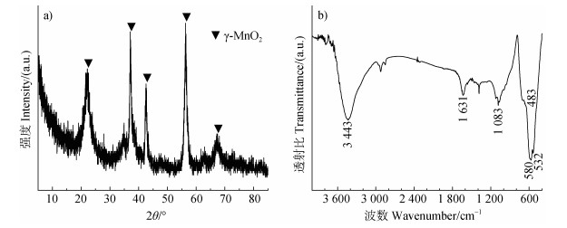 2 结果 2.1 γ-MnO2形态表征图 1a中显示该二氧化锰XRD图谱的特征衍射峰分别为21.9°、37.2°、42.5°、56.0°和67.3°,与六方锰矿(γ-MnO2)的特征衍射峰[23]一致。因此,本研究所用二氧化锰的具体晶型为γ-MnO2(PDF No. 14-0644),为软锰矿与拉锰矿相互有规则交替连生在一起,其有1×1和1×2隧道结构交互生长。利用FTIR对该二氧化锰进行表征分析(图 1b),位于483、532和580 cm−1处特征吸收峰为γ-MnO2结构中Mn–O伸缩振动[24-25]。1 083 cm−1处特征吸收峰为γ-MnO2结构中Mn(Ⅲ)–OH振动[25-26]。3 443 cm−1和1 631 cm−1处吸收峰分别为H2O分子中O−H伸缩振动和H−O−H弯曲振动[26]。