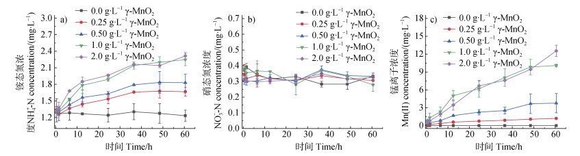 图 10 在pH 7.0和空气氛围条件下,SP(0.25 g∙L−1)与不同初始浓度γ-MnO2混合体系中溶解态NH4+-N(a)、NO3–-N(b)和Mn(Ⅱ)(c)浓度 Fig. 10 Concentrations of dissolved NH4+-N (a), NO3–-N (b), and Mn(Ⅱ) (c) in the systems of SP (0.25 g∙L–1) with different concentrations of γ-MnO2 at pH 7.0 in air atmosphere |