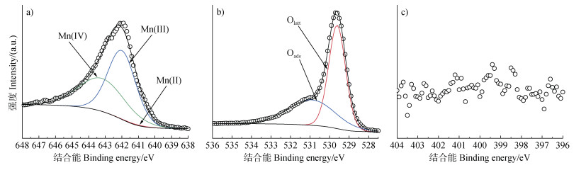 进一步利用X-射线光电子能谱仪对该二氧化锰表面Mn、O和N的价态和化学键进行表征分析(图 2),其Mn、O和N元素拟合的含量百分比结果呈现在表 1中。Mn 2p位于641.10、642.00和643.20 eV处的三个结合能峰可分别归属于Mn(Ⅱ)、Mn(Ⅲ)和Mn(Ⅳ)[27-28]。O 1s位于529.61和530.91 eV的两个结合能峰可分别归属于γ-MnO2中的晶格氧(Olatt)和矿物表面的吸附氧(Oads)[27-29]。