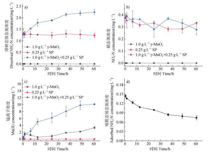 图 3 在pH 7.0和空气氛围条件下,蛋白胨(SP)(0.25 g∙L–1)单一体系、γ-MnO2(1.0 g∙L–1)单一体系以及SP(0.25 g∙L–1)与γ-MnO2(1.0 g∙L–1)混合体系中溶解态NH4+-N(a)、NO3–-N(b)、Mn(Ⅱ)(c)和混合体系中吸附态NH4+-N(d)浓度 Fig. 3 Concentrations of dissolved NH4+-N (a), NO3–-N (b) and Mn(Ⅱ) (c) in the reaction system of soy peptone (SP) (0.25 g∙L–1), γ-MnO2 (1.0 g∙L–1), and SP (0.25 g∙L–1) + γ-MnO2 (1.0 g∙L–1), and concentrations of adsorbed NH4+-N (d) in the systems of SP (0.25 g∙L–1) + γ-MnO2 (1.0 g∙L–1) at pH 7.0 in air atmosphere |