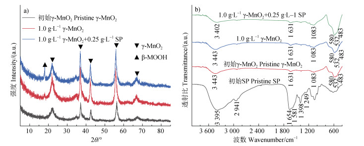 图 4 在pH 7.0和空气氛围条件下,SP(0.25 g∙L–1)单一体系、γ-MnO2(1.0 g∙L–1)单一体系以及SP(0.25 g∙L–1)与γ-MnO2(1.0 g∙L–1)混合体系中固相产物的XRD图谱(a)和FTIR光谱(b) Fig. 4 XRD patterns (a) and FTIR spectra (b) of the solid products in the reaction system of SP (0.25 g∙L–1), γ-MnO2 (1.0 g∙L–1), and SP (0.25 g∙L–1) + γ-MnO2 (1.0 g∙L–1) at pH 7.0 in air atmosphere |