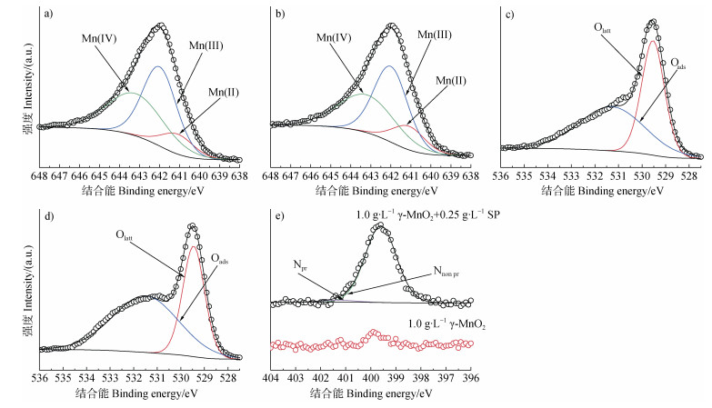 注:Nnon pr:非质子化态氮,Npr:质子化态氮。下同。 Note: Nnon pr: non-protonated nitrogen, Npr: protonated nitrogen. The same below. 图 5 在pH 7.0和空气氛围条件下,γ-MnO2(1.0 g∙L–1)单一体系反应60 h后固相产物的Mn 2p(a)、O 1s(c)和N 1s(e)以及SP(0.25 g∙L–1)与γ-MnO2(1.0 g∙L–1)混合体系反应60 h后固相产物的Mn 2p(b)、O 1s(d)、N 1s(e)XPS光谱图 Fig. 5 XPS Mn 2p (a), O 1s (c), N 1s (e) spectra of solid products in the system of γ-MnO2 (1.0 g∙L−1), and XPS Mn 2p (b), O 1s (d), N 1s (e) spectra of solid products in the system of SP (0.25 g∙L–1) + γ-MnO2 (1.0 g∙L–1) after 60 h at pH 7.0 in air atmosphere |