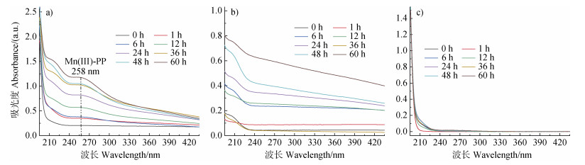 近期研究表明,锰氧化物在氧化溶解过程中可产生活性中间体Mn(Ⅲ)和活性氧物种,这些活性中间体可促使有机质氧化分解[9,28-29]。为了探明Mn(Ⅲ)和活性氧物种在γ-MnO2和蛋白胨相互作用过程中的影响,定性以及定量检测了反应过程中活性中间体的种类与浓度。图 7为pH 7.0、空气氛围条件下,γ-MnO2+焦磷酸钠(Na-PP)、γ-MnO2、Na-PP溶液的紫外-可见全波段扫描光谱。Na-PP能够将反应体系中可能生成的Mn(Ⅲ)络合生成Mn(Ⅲ)-PP,其在258 nm处有特征吸收峰[20]。γ-MnO2+ Na-PP体系在258 nm处有吸收,且吸光度随着时间增加而逐渐增强(图 7a),然而γ-MnO2、Na-PP溶液在258 nm处均未出现特征吸收峰(图 7b和图 7c)。因此,在γ-MnO2氧化溶解过程中有活性中间体Mn(Ⅲ)产生。