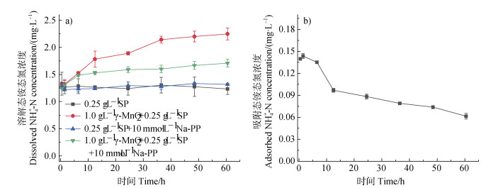 图 8 在pH 7.0、空气氛围和添加10.0 mmol∙L−1 Na-PP条件下,SP(0.25 g∙L−1)单一体系以及SP(0.25 g∙L–1)与γ-MnO2(1.0 g∙L–1)混合体系中溶解态NH4+-N浓度(a),混合体系中吸附态NH4+-N浓度(b) Fig. 8 Concentrations of dissolved NH4+-N in the systems of SP (0.25 g∙L–1), and SP (0.25 g∙L–1) + γ-MnO2 (1.0 g∙L–1) (a), concentrations of adsorbed NH4+-N in the systems of SP (0.25 g∙L–1) + γ-MnO2 (1.0 g∙L–1) (b) with the addition of 10.0 mmol∙L−1 Na-PP at pH 7.0 in air atmosphere |