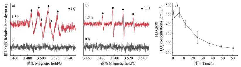 图 9 在pH 7.0和空气氛围条件下,SP(0.25 g∙L–1)与γ-MnO2(1.0 g∙L–1)混合体系中超氧根自由基(O2•−)(a)和羟基自由基(·OH)(b)的电子顺磁共振(EPR)光谱及γ-MnO2(1.0 g∙L–1)单一体系中生成瞬时过氧化氢(H2O2)浓度(c) Fig. 9 Electron paramagnetic resonance (EPR) spectra of superoxide radical (O2•−) (a), and hydroxyl radical (·OH) (b) in the mixed system of SP (0.25 g∙L–1) + γ-MnO2 (1.0 g∙L–1) and instant concentration of hydrogen peroxide (H2O2) (c) in the system of γ-MnO2 (1.0 g∙L−1) at pH 7.0 in air atmosphere |