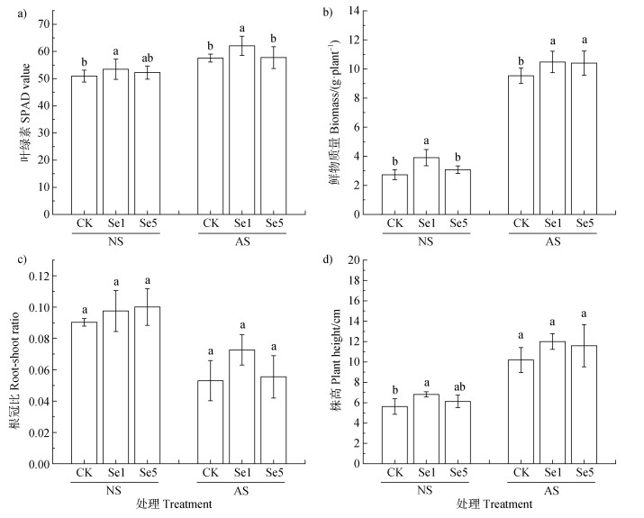 2 结果 2.1 叶面喷施生物纳米硒肥对小青菜生长的影响叶面喷施不同浓度生物纳米硒对小青菜植株生长的影响结果如图 1所示。由图 1a可知,叶面喷施1 mg·L–1生物纳米硒(Se1)能显著(P < 0.05)提升两种土壤下小青菜叶绿素含量;相较各自不喷施硒的对照组(CK),中性土壤(NS)和碱性土壤(AS)中Se1处理组的SPAD分别提升了4.9%和8.0%(P < 0.05);叶面喷施5 mg·L–1(Se5)生物纳米硒对叶绿素含量也有影响,但与对照相比差异不显著。由图 1b和图 1c可知,生物纳米硒能够有效增加两种土壤中小青菜植株地上部鲜物质量与根冠比;中性土壤中,与CK相比,喷施纳米硒处理组的植株地上部鲜物质量和根冠比分别增加了12.8%~43.1%和8.0%~10.8%;碱性土壤中,与CK相比,喷施纳米硒处理组的植株地上部鲜物质量和根冠比分别增加了9.1%~9.9%和4.6%~37.0%。此外,图 1d结果表明叶面喷施生物纳米硒也能增加株高;中性土壤中,Se1和Se5处理组的株高较CK组的分别增加了21.1%和8.9%(P < 0.05);碱性土壤中,Se1和Se5处理对株高也有影响,但与对照相比差异不显著。