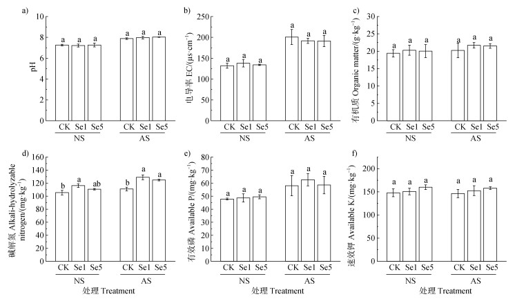 叶面喷施不同浓度生物纳米硒,对小青菜根际土壤理化性质的影响结果如图 2所示。相较CK,叶面喷施生物纳米硒处理对土壤pH、EC、有机质、有效磷和速效钾均无显著影响(P > 0.05)(图 2a~图 2c,图 2e~图 2f)。由图 2d结果可知,叶面喷施生物纳米硒后,中性土壤碱解氮含量较CK的提升了4.98%~10.19%,碱性土壤中的碱解氮含量较CK提升了12.39%~16.22%。