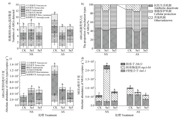 图 3 叶面喷施生物纳米硒对小青菜根际土壤中抗生素抗性基因(ARGs)数量(a)、机制类型(b)及其绝对丰度(c)和可移动遗传元件(MGEs)绝对丰度(d)的影响 Fig. 3 Effects of foliar application of bio-selenium nanoparticles on the numbers(a), mechanism types(b), and absolute abundance of antibiotic resistance genes(ARGs)(c)and absolute abundance of mobile genetic elements(MGEs)(d)in the rhizosphere soil of Brassica rapa L. |