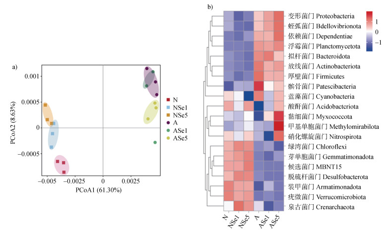 采用PCoA进一步对小青菜根际土壤细菌群落β多样性进行分析,结果如图 4a所示。不同土壤条件下,Se1、Se5处理与对照CK间均呈现出明显群落结构分异。这说明在OTU水平上,叶面喷施生物纳米硒使中性土壤和碱性土壤中的细菌群落结构均发生了显著变化(P < 0.05)。为进一步明确不同处理下土壤细菌结构组成,将所有根际土壤细菌样本相对丰度前20的门绘制成热图,结果如图 4b所示。显然,两种土壤之间相比,细菌群落优势门的分布具有明显差异。中性土壤条件下,Se1、Se5处理均使泉古菌门(Crenarchaeota)、脱硫杆菌门(Desulfobacterota)、芽单胞菌门(Gemmatimonadota)、绿湾菌门(Chloroflexi)和髌骨细菌门(Patescibacteria)的相对丰度增加。碱性土壤条件下,Se1、Se5处理均使变形菌门(Proteobacteria)、蛭弧菌门(Bdellovibrionota)、酸杆菌门(Acidobacteriota)和黏球菌门(Myxococcota)相对丰度得到增加,同时降低了泉古菌门(Crenarchaeota)、绿湾菌门(Chloroflexi)、蓝藻菌门(Cyanobacteria)、髌骨细菌门(Patescibacteria)、厚壁菌门(Firmicutes)、放线菌门(Actinobacteria)的相对丰度。对于两种土壤,Se5处理显著增加了硝化螺菌门(Nitrospirota)、Methylomirabilota、黏球菌门(Myxococcota)、酸杆菌门(Acidobacteriota)的相对丰度。