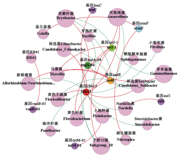 进一步通过网络分析探讨根际土壤优势菌门与ARGs以及MGEs的共现性关系,如图 5所示。图中红色连线为显著正相关,绿色连线为显著负相关,共有20种细菌属与ARGs存在显著相关性,与ARGs呈显著正相关的细菌门被视为潜在宿主。所有土壤样本中,ARGs的潜在宿主包括14种(Candidatus_ Udaeobacter、Bryobacter、Flavisolibacter、Pedobacter、RB41、Massilia、Nitrospira、Flavobacterium、Anaerolinea、Gaiella、Candidatus_Solibacter、Allorhizobium-eorhizobium- Pararhizobium-Rhizobium、Gemmatimonas、Subgroup_10)。