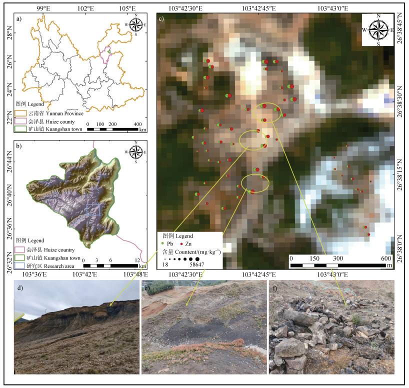 1 材料与方法 1.1 研究区概况和试验数据收集研究区位于云南省会泽县矿山镇某铅锌尾矿区(26°37′39″~26°38′56″N,103°42′17″~103°43′47″E),属于典型温带高原季风气候,年平均气温和降雨量分别为13℃和807mm。该区域铅锌矿床是川滇黔铅锌成矿区内典型的大型富铅锌矿床之一[16]。该矿区在开采和冶炼过程中,由于废气、废水、废料和尾矿的堆放及淋溶,导致矿区周围土壤重金属含量不同程度地超标,对周边生态环境造成了严重影响[17]。2024年3月,采用梅花形5点混合采样法(范围为:5 m×5 m)进行采样。采集深度为0~20 cm,去除石块、动植物残体等杂质后约取1 kg土样,共采集56个土壤样品,同时记录每个采样点的地理坐标及周围环境情况。研究区地理位置、采样点分布以及实地照片如图 1所示。