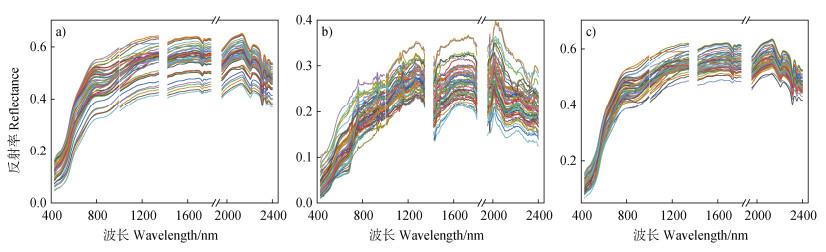 图 2 实验室光谱曲线(a)、GF-5影像光谱曲线(b)和校正后光谱曲线(c) Fig. 2 Laboratory spectrum curve(a), GF-5 image spectrum curve(b), and corrected spectrum curve(c) |