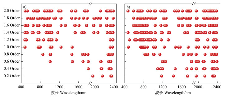 对OR进行分数阶微分处理后,运用Boruta算法筛选特征波段。如图 4所示,经Boruta算法筛选得到的Pb和Zn特征波段分布基本一致,其中高阶筛选获得的特征波段数量较多,而低阶筛选获得的相对较少。使用高阶微分(≥1.0阶)时,两种重金属元素特征波段主要集中在700~1 000 nm、1 400~1 750 nm和2 250~2 400 nm范围内,而低阶微分处理下,特征波段少部分位于可见光区域,更多集中于近红外和短波红外区域。