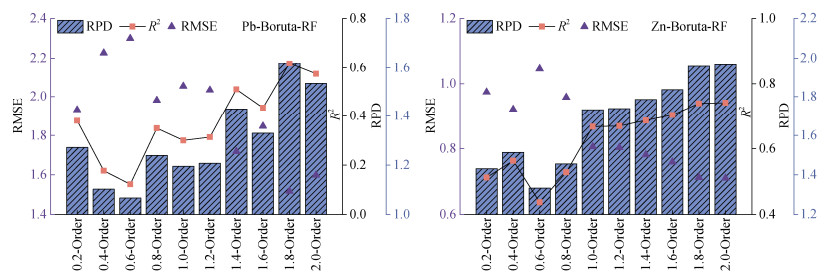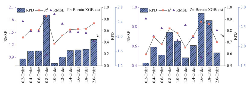 图 6 不同微分阶数下XGBoost模型对Pb和Zn含量估算的各项指标 Fig. 6 Evaluation metrics for the estimation of Pb and Zn content using the XGBoost model at different differential orders |
