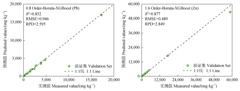为了更加直观地展示模型在预测Pb和Zn含量方面的性能,绘制了Pb和Zn最佳反演模型验证集的实测值和预测值拟合图(见图 7)。从图中可以看出,预测值和实测值基本分布在1:1直线周围,表明模型具有较高的预测精度。因此将0.8 Order-Boruta-XGBoost和1.6 Order-Boruta-XGBoost分别作为预测该矿区Pb和Zn含量的最佳反演模型,可有效揭示研究区内铅锌含量的分布情况。