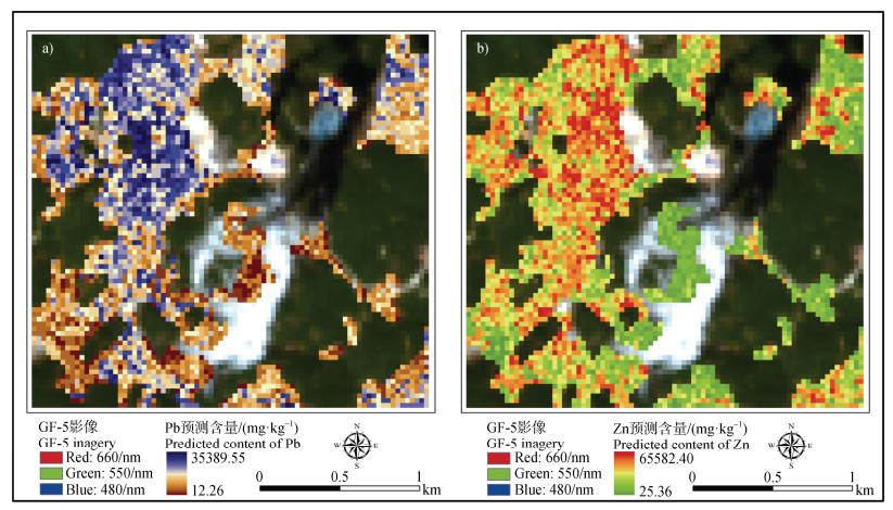 图 8 应用最佳反演模型估算的Pb(a)和Zn(b)含量分布图 Fig. 8 Distribution map of Pb(a)and Zn(b)content estimated by the optimal inversion model |