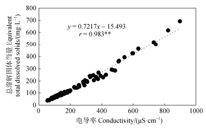 图 1 水质测量笔测定的当量总溶解固体与实验室电导率仪测定的电导率间的相关性 Fig. 1 Correlation analysis of equivalent total dissolved solids(ETDS)measured by water quality meter and electrical conductivity measured by laboratory conductivity meter |