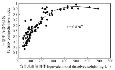 图 2 水质测量笔速测ETDS值与土壤肥力综合指数的相关性 Fig. 2 Correlation analysis between equivalent total dissolved solids and fertility comprehensive index |