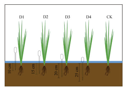 注:D1、D2、D3、D4分别为不同插管深度处理,CK为空白对照组。Note:D1,D2,D3,and D4 represent treatments with different tube insertion depths,while CK denotes the blank control group. 图 1 试验示意图 Fig. 1 Schematic diagram of the experiment |