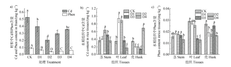 如图 2所示,调节根际微氧环境能显著降低水稻成熟期糙米中Cd和菲含量,插管后糙米中Cd的含量为0.10~0.53 mg·kg–1,菲含量为0.045~0.091 mg·kg–1(图 2a)。与对照组相比,处理组糙米中Cd含量下降了24.2%~61.1%(P < 0.05),菲含量下降了26.1%~50.6%。插入深度为15 cm(D2)组中Cd和菲含量下降幅度最大,糙米中Cd平均含量为0.20 mg·kg–1,菲含量为0.045 mg·kg–1。相较于对照组(CK),不同插管深度处理组水稻茎、叶、稻壳中Cd含量显著上升(图 2b),水稻茎中菲含量显著上升(图 2c),可能是根部污染物向上部迁移转运致使水稻茎、叶中Cd和菲含量上升。