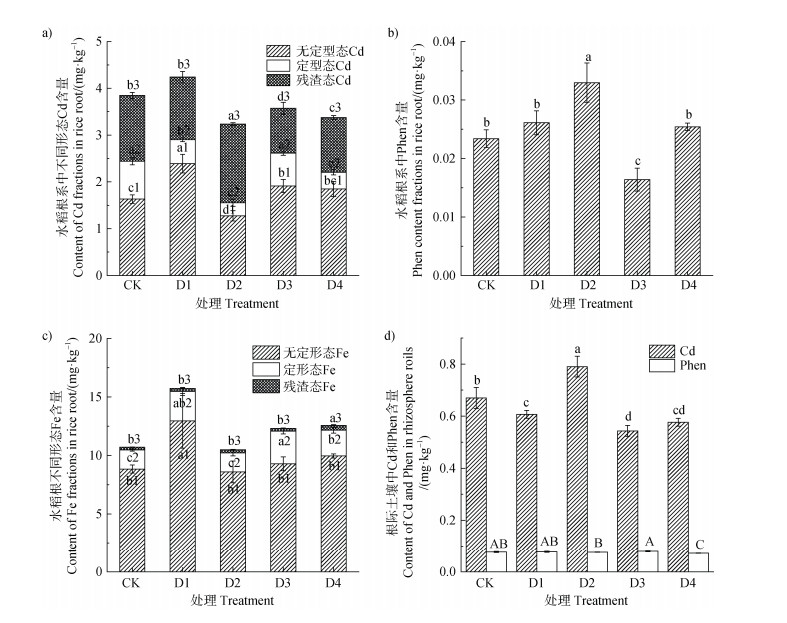 图 3 水稻根系中Cd含量和赋存形态(a)、菲含量(b)、Fe含量和赋存形态(c)、水稻根际土壤中Cd和菲总量(d) Fig. 3 The content and chemical forms of Cd(a), phenanthrene(b)and Fe(c)in the root system of rice, the total amount of Cd and phenanthrene(d) |