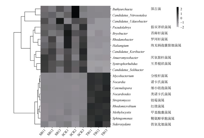 注:SB:根际土壤样品;TB:管壁土壤样品;SCK:对照组根际土壤。下同。Note:SB:Rhizosphere soil sample;TB:Sample of iron oxide on the pipe wall;SCK:Control treatment. The same below. 图 4 属水平细菌群落丰度热图 Fig. 4 Heat map of genus-level bacterial community abundance |