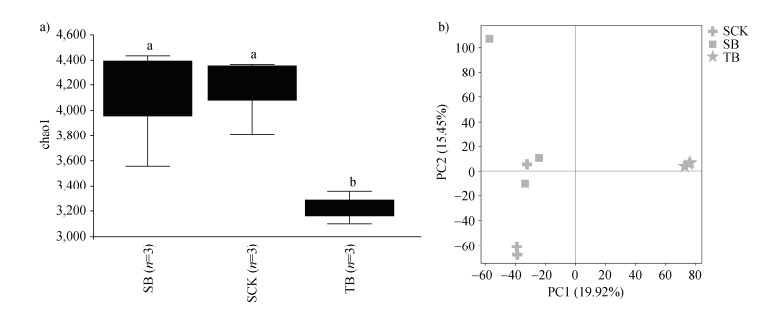 图 5 Chao1指数(a)和PCA主成分分析(b) Fig. 5 Chao1 index(a)and principal component analysis(PCA)(b) |