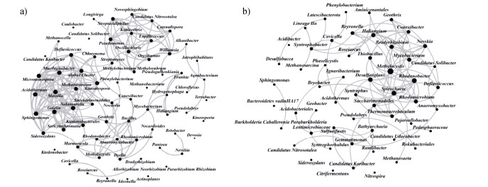 图 6 根际细菌群落共现网络特征:土壤(a);管壁土壤(b) Fig. 6 Analysis of co-occurrence networks of rhizosphere bacterial communities: Soil(a), Tube surface soil(b) |