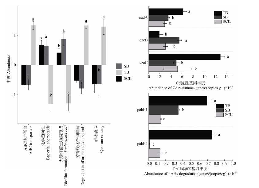 如图 7b和图 7c所示,SB组中cadA、czcB和pahE1的丰度分别为3.54×105 copies·g–1、5.52×105 copies·g–1和0.352×108 copies·g–1。相较于对照组,分别提高了1.22倍、1.83倍和2.41倍。与SB组相比,TB组中cadA、czcC、pahE1和pahE4基因丰度上升,但是czcB丰度低于SB组,这可能是管壁土壤中较简单的群落结构和较低的细菌丰度导致的。qPCR结果表明,调节水稻根际微氧环境能显著上调根际土壤中细菌抗Cd和菲基因的表达,促进根际微生物群落对Cd和菲的阻控。