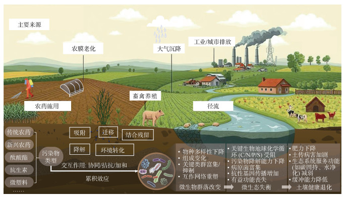 土壤作为地球关键带核心组分,其微生态系统(即土壤微生物组)是由土壤中所有的微生物(包括细菌、真菌、古菌、原生动物和病毒等)及其遗传信息和所处环境共同构成的复杂生态系统,是支撑粮食生产和生态系统服务的基础资源[1]。耕地土壤微生态健康对保障作物高产稳产、农产品质量及农业绿色转型至关重要[2-3]。然而,高强度人为活动的持续影响致使全球耕地土壤遭受传统农药和新污染物(如酞酸酯类塑化剂、抗生素和微塑料)等多种有机污染物的复合胁迫[4-6],严重威胁了土壤微生态的稳态、功能和恢复力[6-7],成为当前限制耕地产能提升和农业可持续发展的关键瓶颈。