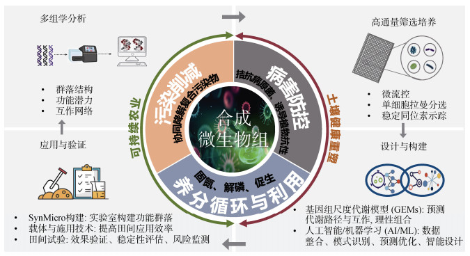 5 结论耕地土壤有机复合污染存在普遍性、复杂性,其引发的微生物群落失衡、功能紊乱及土壤健康退化等深层影响对土壤微生态健康构成潜在风险,已成为全球性挑战,严重威胁土壤微生态健康和农业可持续发展。以合成微生物组学(SynMicro)为代表的现代分子生物学技术,为精准干预和重塑受损土壤微生态系统提供了前沿策略。面向上述挑战,通过理性设计SynMicro,构建功能明确、结构简化的微生物群落,可以实现污染削减、病害防控、养分利用及多功能的协同。后续应进一步整合多组学技术、高通量筛选、基因组尺度代谢模型、人工智能等前沿工具,推动SynMicro从机制理解走向智能化设计与工程构建,实现其在复杂土壤环境中的高效应用和田间转化;同时,还应进一步完善生态安全性评估和监管政策,确保该技术能可持续发展。未来,通过多学科交叉与技术集成创新,有望有效重塑耕地土壤微生态健康,为保障国家粮食安全和实现农业绿色可持续发展提供坚实支撑。