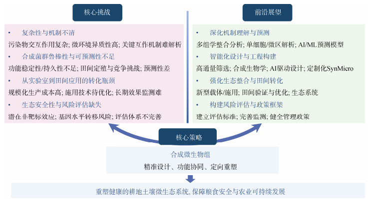 4 挑战与展望尽管合成微生物组学可为有机复合污染下耕地土壤微生态健康重塑提供前所未有的机遇,但将其从概念推向普适有效的田间应用仍面临多重核心挑战(图 3)。首先,有机复合污染所致的高度时空异质性土壤微环境为精准解析菌群互作机制及环境影响带来巨大挑战[11,57]。其次,SynMicro构建应用鲁棒性与可预测性待提升,需高效筛选组装具稳定定殖的持久功能菌株,有效克服外源菌与本土菌的竞争[15]。再者,生态安全性与风险评估体系待完善,需评估外源菌潜在环境风险(基因转移、非靶标影响、抗性诱导)[25,28],建立健全风险评估框架和监管政策。最后,实验室到田间转化有距离,涉及菌剂生产、施用技术、长期监测等难题[12]。
