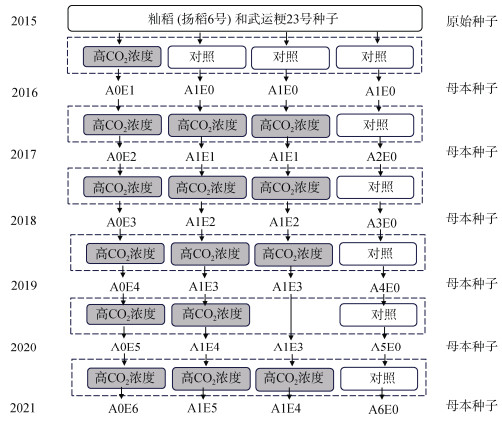 1.2 试验材料和栽培管理供试籼稻品种为扬稻6号(YD6),粳稻品种为武运粳23号(WYJ23)。每个品种最初母代种子均在对照条件下获得,然后种植在高CO2浓度环境或对照环境中,收获后种子再分别种入对应环境中。以此往复,经过2015—2021年连续种植,形成不同生长CO2浓度历史的子代种子。2020年本研究开始时,A5E0种子经过连续5个对照生长季;A1E3种子经过1个对照生长季、3个高CO2浓度生长季;A1E4种子经过1个对照生长季,4个高CO2浓度生长季;A0E5种子经过连续5个高CO2浓度生长季。2021年以此类推,具体见图 1。将A5E0和A6E0种子分别种植于高CO2浓度环境和对照环境中,模拟当代骤增CO2浓度试验;而A1E3、A1E4、A0E5、A1E5和A0E6的种子分别种植在高CO2浓度环境和对照环境中,模拟多子代CO2浓度升高试验。