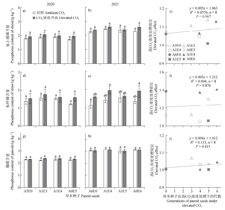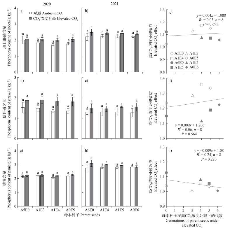 图 2 2020年和2021年扬稻6号成熟期各子代植株不同部位磷含量对CO2浓度升高的响应 Fig. 2 Phosphorus content of shoot, straw, and panicle under ambient CO2 and elevated CO2, and the ratio in phosphorous content of different organs at ambient CO2 to elevated CO2, for all generations of cv. YD6 in 2020 and 2021 in FACE experiments |
