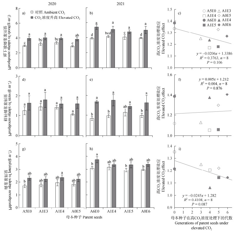 以Excel进行数据处理和图表绘制。以SPSS 25.0进行统计分析,采用方差分析(ANOVA)及最小显著差异法(LSD)分析比较不同处理间的差异。为说明高CO2浓度处理对植株磷素积累与分配的影响是否与母本种子在高CO2浓度下的代际数有关,构建两者的线性关系。当P < 0.05时,认为差异显著或线性相关。