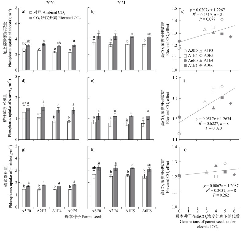 对扬稻6号当代植株(A5E0和A6E0)而言,CO2浓度升高能够显著增加地上部、秸秆和穗的磷素积累量。地上部磷素积累量的增幅为36.0%(图 4a、图 4b),秸秆磷素积累量的增幅为65.5%(图 4d、图 4e),穗磷素积累量的增幅为28.5%(图 4g、图 4h)。对杨稻6号子代植株(A2E3、A1E4、A0E5、A2E4、A1E5和A0E6)而言,CO2浓度升高显著增加各子代地上部磷素积累量以及A1E4和A0E6秸秆磷素积累量。具体表现为:各子代地上部磷素积累量的增幅为23.9%(图 4a、图 4b),秸秆磷素积累量的增幅为43.3%(图 4d、图 4e)以及穗磷素积累量的增幅为17.1%(图 4g、图 4h)。对比子代与当代研究结果表明,CO2浓度升高对子代植株地上部、秸秆和穗的磷素积累量的增幅要低于当代植株的增幅效应。对武运粳23号当代植株(A5E0和A6E0)而言,CO2浓度升高仅显著增加A5E0穗的磷素积累量,增幅为22.1%(图 5g)。对武运粳23号子代植株(A2E3、A1E4、A0E5、A2E4、A1E5和A0E6)而言,CO2浓度升高显著增加A2E3、A1E4、A0E5、A2E4、A1E5和A0E6地上部和穗的磷素积累量(图 5a、图 5b、图 5g、图 5h),以及A1E4和A0E5秸秆的磷素积累量(图 5d、图 5e)。对比子代与当代研究结果表明,CO2浓度升高对武运粳23号子代植株地上部、秸秆和穗的磷素积累量的增幅要高于当代植株的增幅效应(图 5c、图 5f、图 5i)。线性回归分析表明,高CO2浓度对武运粳23号植株秸秆磷素积累量的增幅效应均随着母本种子在高CO2浓度处理下的代数的增加而显著线性增加(图 5f,P < 0.05)。