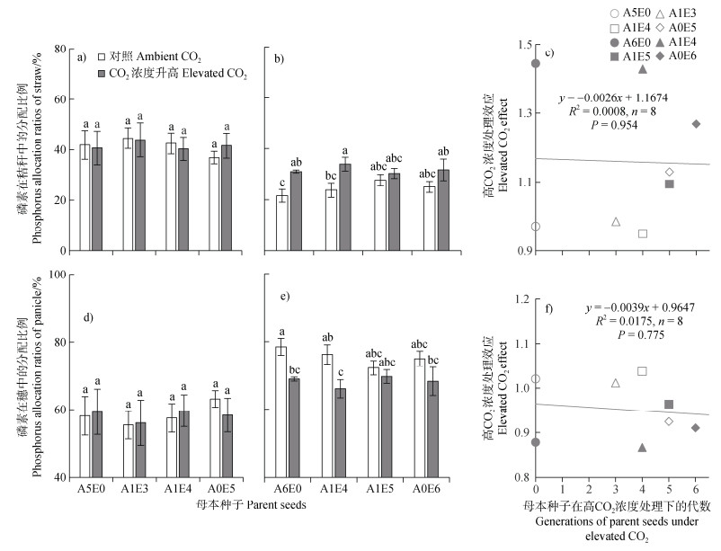 对扬稻6号当代植株而言,CO2浓度升高显著增加A6E0秸秆的磷素分配比例,显著降低A6E0穗的磷酸分配比例(图 6d、图 6e)。对各子代植株而言,CO2浓度升高仅显著A2E4秸秆的磷素分配比例,显著降低A2E4穗的分配比例(图 6a、图 6b);对其他子代秸秆和穗的磷素分配比例无显著性的影响。线性回归分析表明,CO2浓度升高对秸秆和穗的磷素分配比例与母本种子在高CO2浓度处理下的代数无显著性的相关性(图 6c、图 6f)。