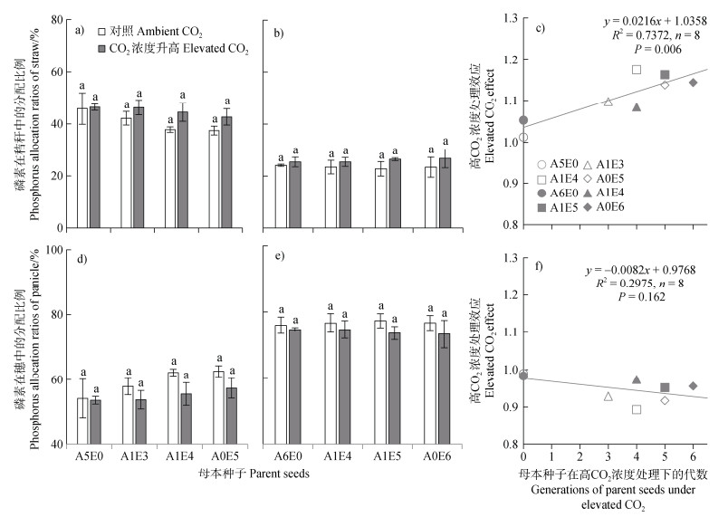 对武运粳23号当代与子代植株而言,CO2浓度升高对秸秆和穗的磷素分配比例均无显著性的影响(图 7a、图 7b、图 7d、图 7e)。线性回归分析表明,高CO2浓度对秸秆磷素积累量的分配比例增幅效应随着母本种子在高CO2浓度处理下的代数的增加而呈线性显著上升(图 7c、图 7f,P < 0.05)。